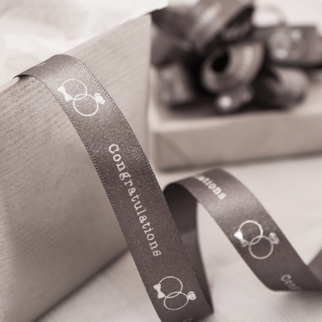 featuring the words ‘congratulations’ and wedding ring loops in metallic silver on a smoked grey ribbon. This is a single sided design.
