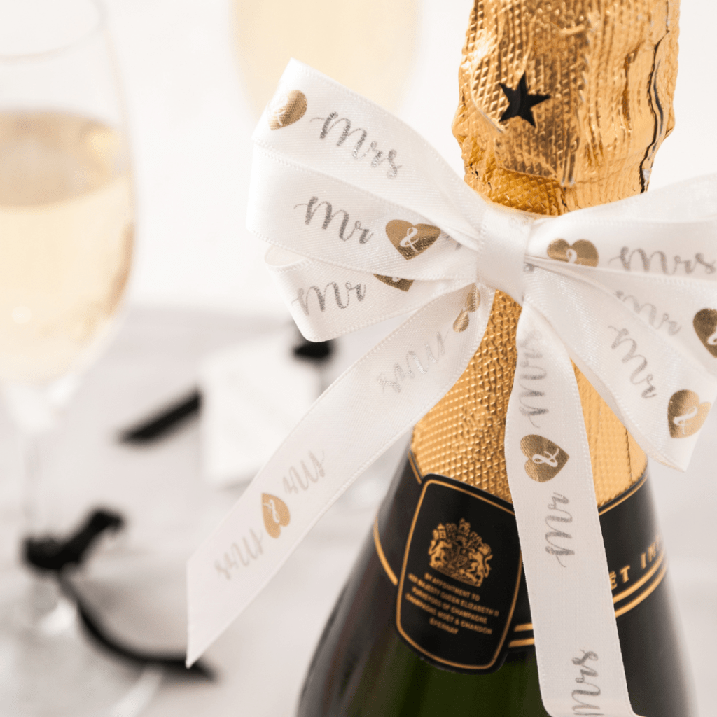 featuring Mr & Mrs in metallic silver print, and a metallic gold love heart between, along a single side of white ribbon.