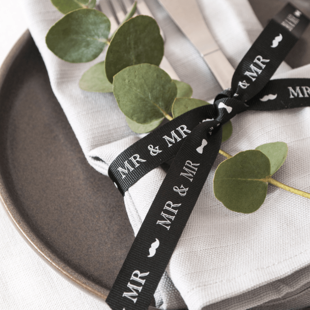 featuring Mr & Mr in white print, on a black ribbon, with a silhouette bow tie and moustache between. This is as single sided design