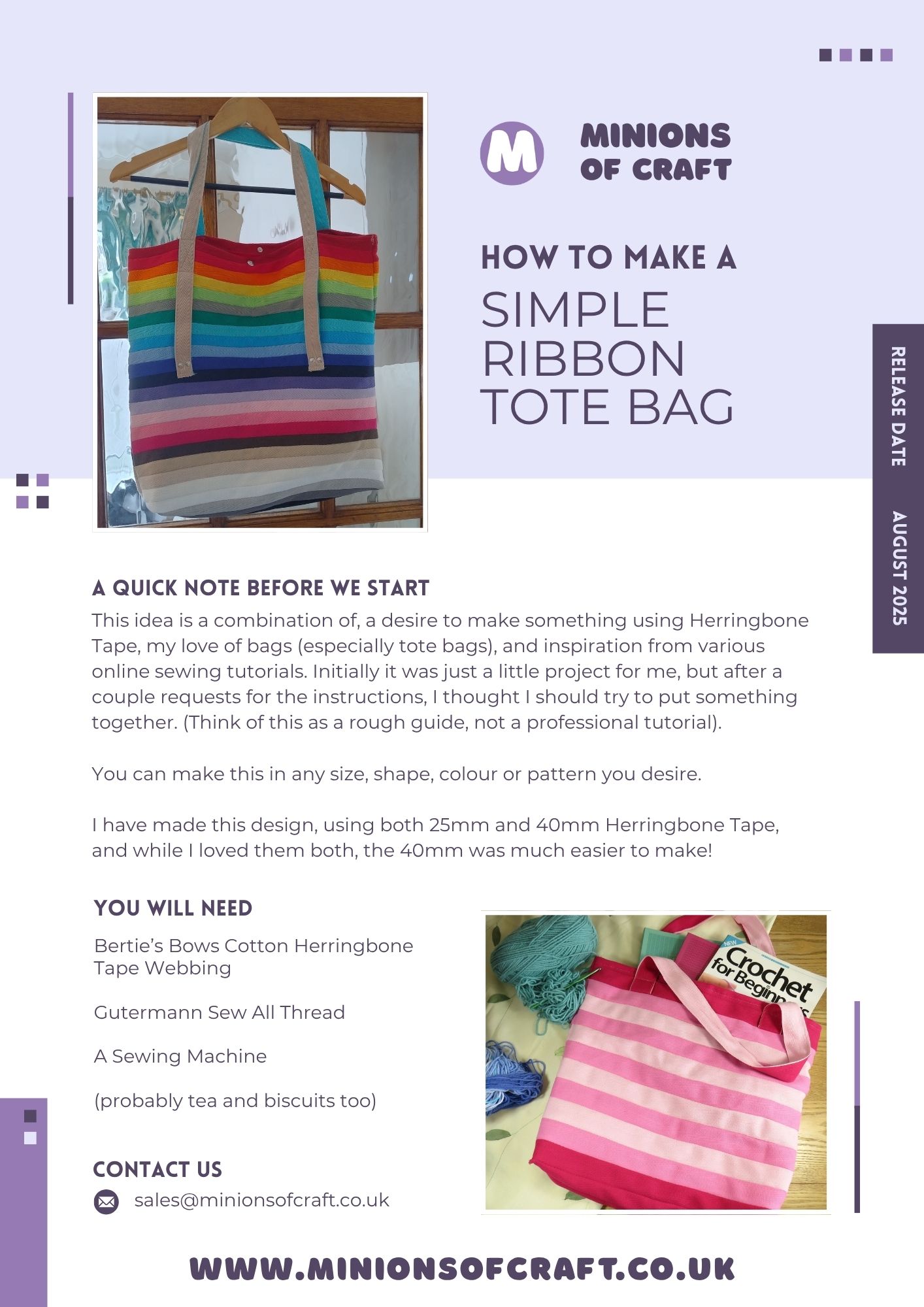 The Ribbon Tote Bag is a simple, but versatile project, which allows you to make your bag any size, shape, colour or pattern, you desire.