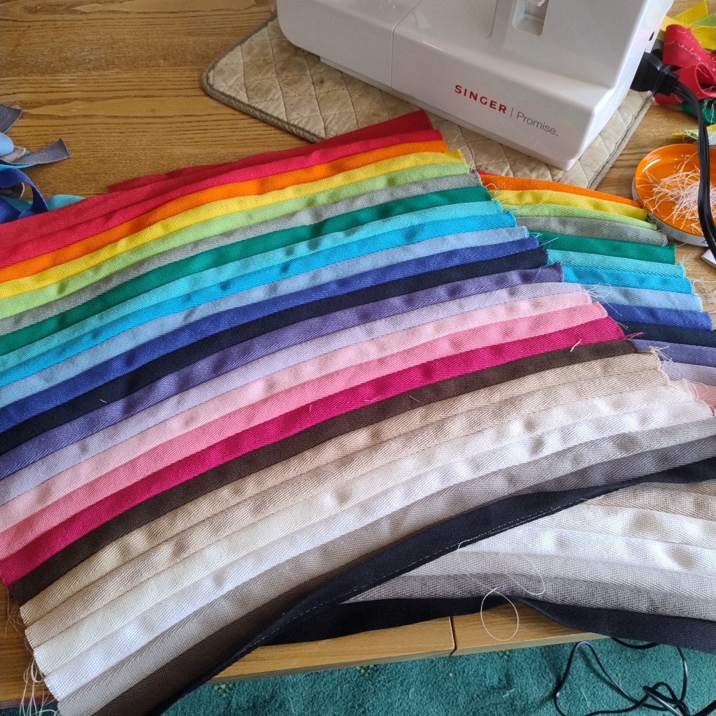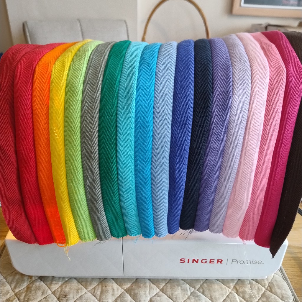 - For the Rainbow Tote Bag and the Pink Tote Bag, I used a simple Plain Seam Stitch, working as close to the edge of the Herringbone Tape as possible.